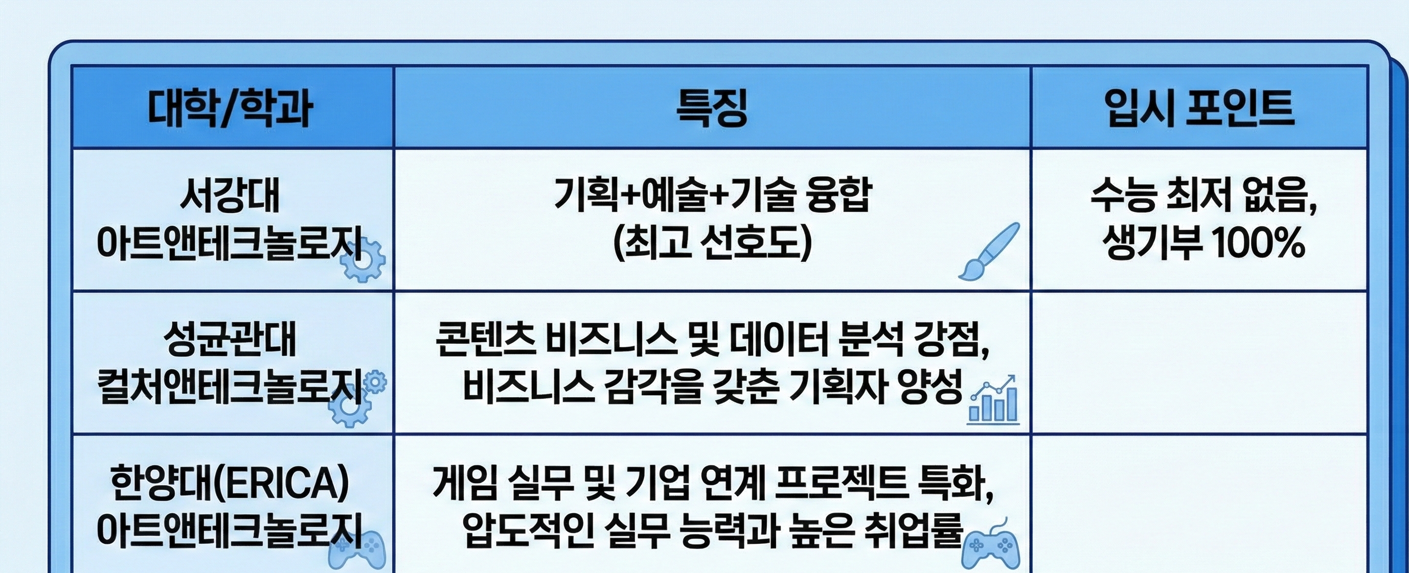 #서강대아트앤테크놀로지 #아텍 #성균관대컬처앤테크놀로지 #한양대에리카 #한양대ERICA #인하대컴퓨터공학과 #인천대컴공 #수시전략 #학생부종합전형 #학종 #생기부관리 #수능최저없음 #입시컨설팅
